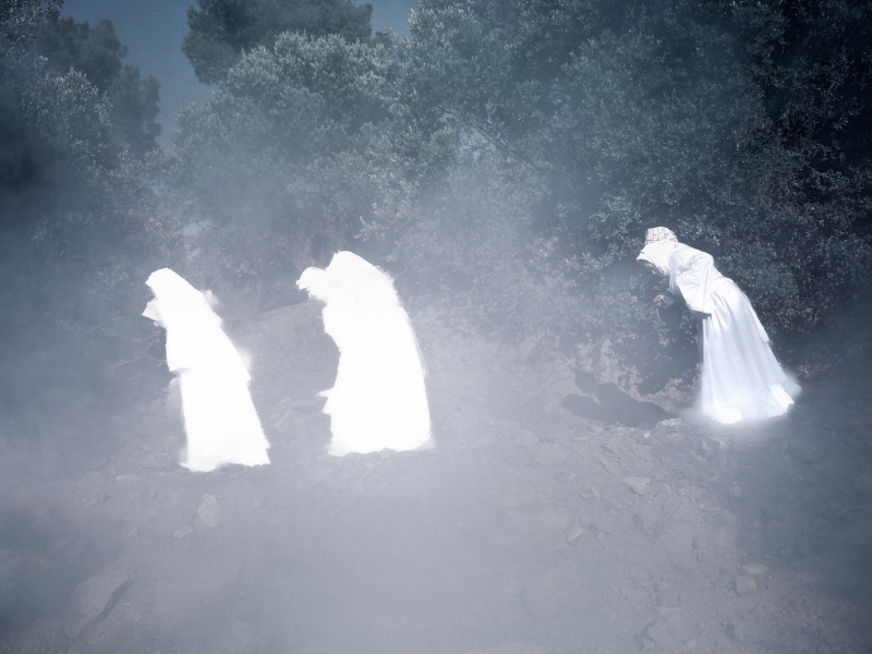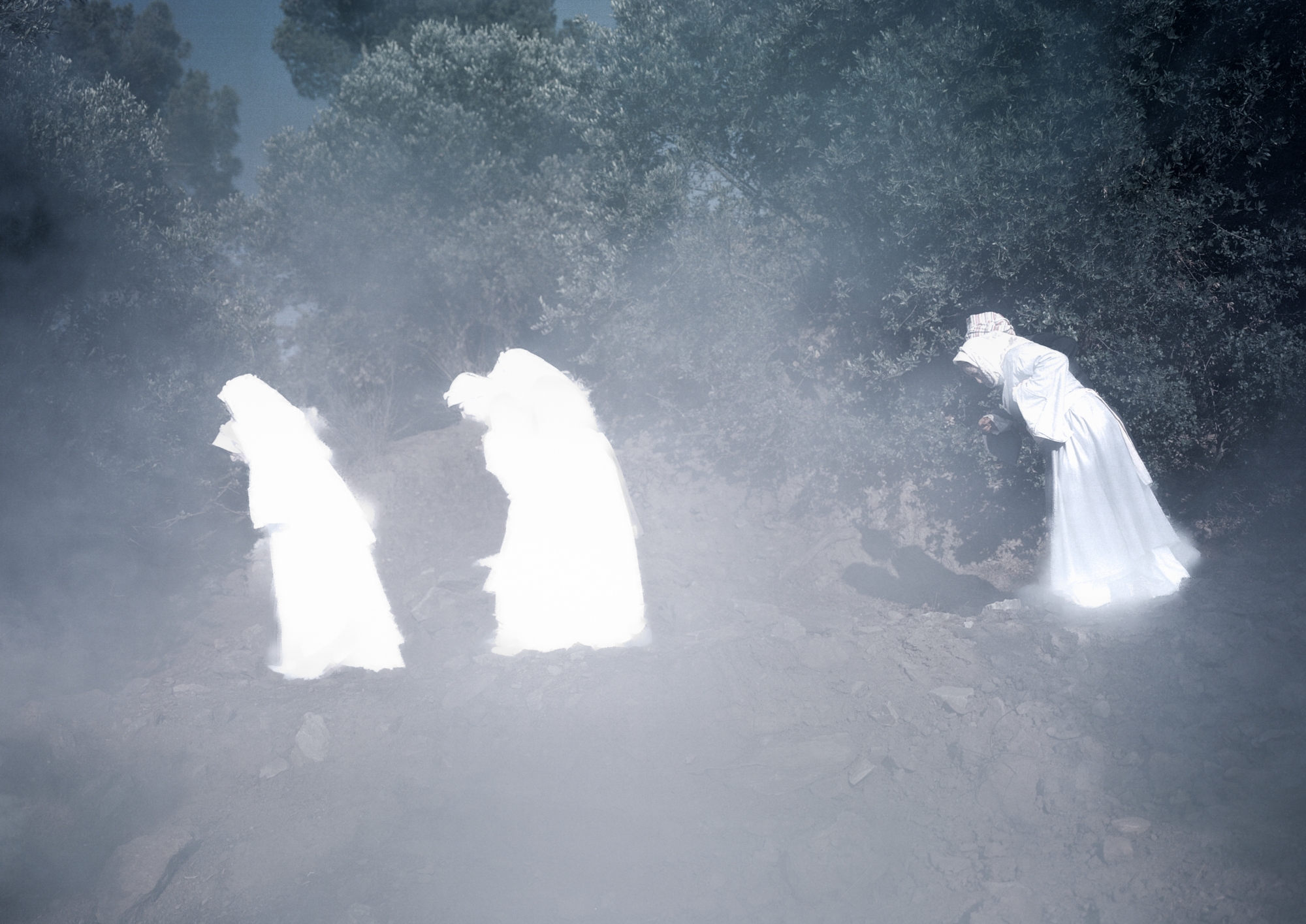 تتّسم صور "المُستلَبون" بحضورٍ ماديٍ حادّ. فالملكية التي تُحرم النساء منها تتجسّد في خشب السقف المتشقّق وورق الحائط المتقشّر. هناك الحميمية اليومية للأدوات المنزلية، والمساكن الخيالية للحيوانات ذات النظرات الساخرة، والعادات الدينية الرقيقة. جسد امرأةٍ تصلّي، مزخرف بنقوش الأزهار، يضيع بين أقمشة مماثلة خارج بيتها، وكأنّ البيت نفسه يبتلعها ببطء، محتفظًا بسلطته المستلبة عليها. لكن الزمن هنا ينساب بطريقة مختلفة. أشباح الماضي، في صورٍ باهتة بالأبيض والأسود، تطارد الحاضر – إذا كان ما نعيشه حاضرًا بالفعل، إذ لا علامات زمنية واضحة تثبت الأرضية. تختبئ الأشباح في المساحات المجهولة، وتستفزّ النساء، بما في ذلك عمّتها ووالدتها، حدودها الطيفية: حدود الأبويّة، وحدود محاولة تمثيلهن البصري. تنحني أجسادهن، وتتشابه أشكالها أحيانًا مع الحيوانات الراعية على الأرض. يجتمعن في الضحك المتشابك، ويعتنين بالحرائق والحقول، متقيّدات ومتوعّدات. ثلاث أقدام معوّجة ترتكز على بطانية، تكاد تكون مشوّهة.