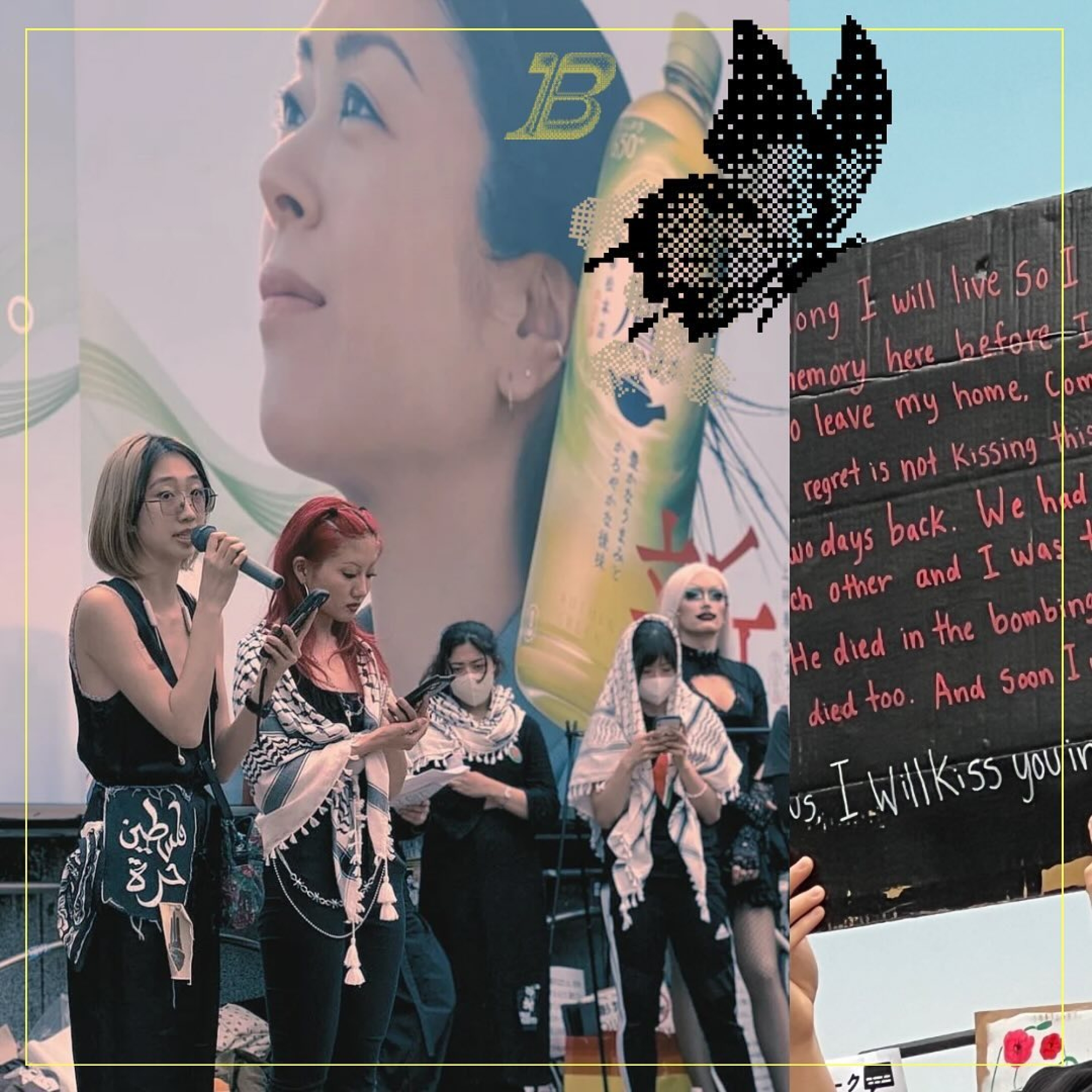 تجميع صور تظهر فيها أوهي (يسار) في احتجاج 21 أبريل/نيسان، ولافتة من الاحتجاج مع منشور Queering the Map (يمين)، وصورة لفراشة سوداء (أعلى). ترمز الفراشات الصفراء إلى الناجيات من العنف الجنسي على يد الجيش الياباني الإمبريالي. أما الفراشة السوداء، ففي هذا السياق، ترمز إلى التضامن مع فلسطين.
