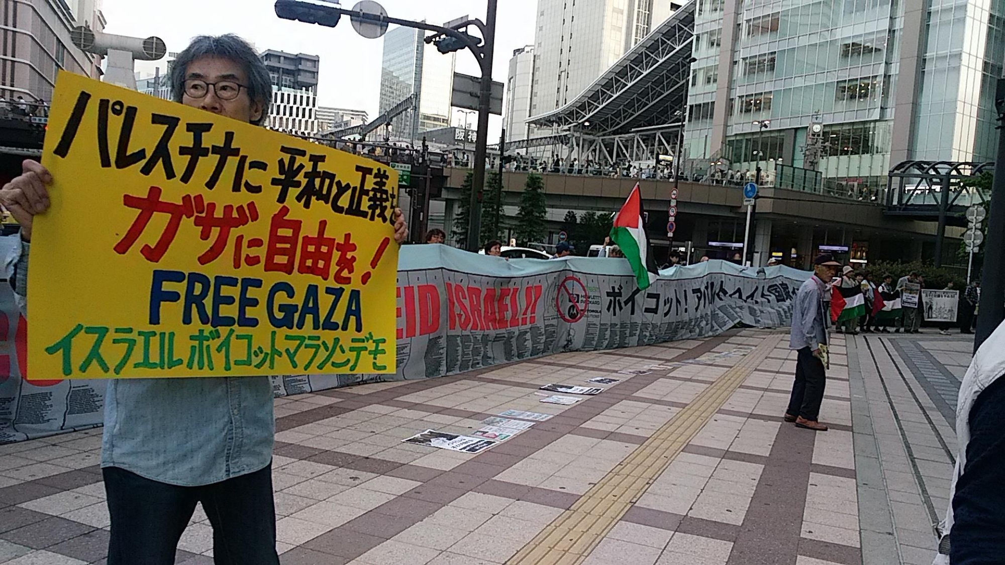 "السلام والعدالة في فلسطين. حرّروا غزة! مظاهرة ماراثون مقاطعة إسرائيل" (تصوير: كازوكو ماتسوا، من مظاهرة ماراثون مقاطعة إسرائيل، 2018).