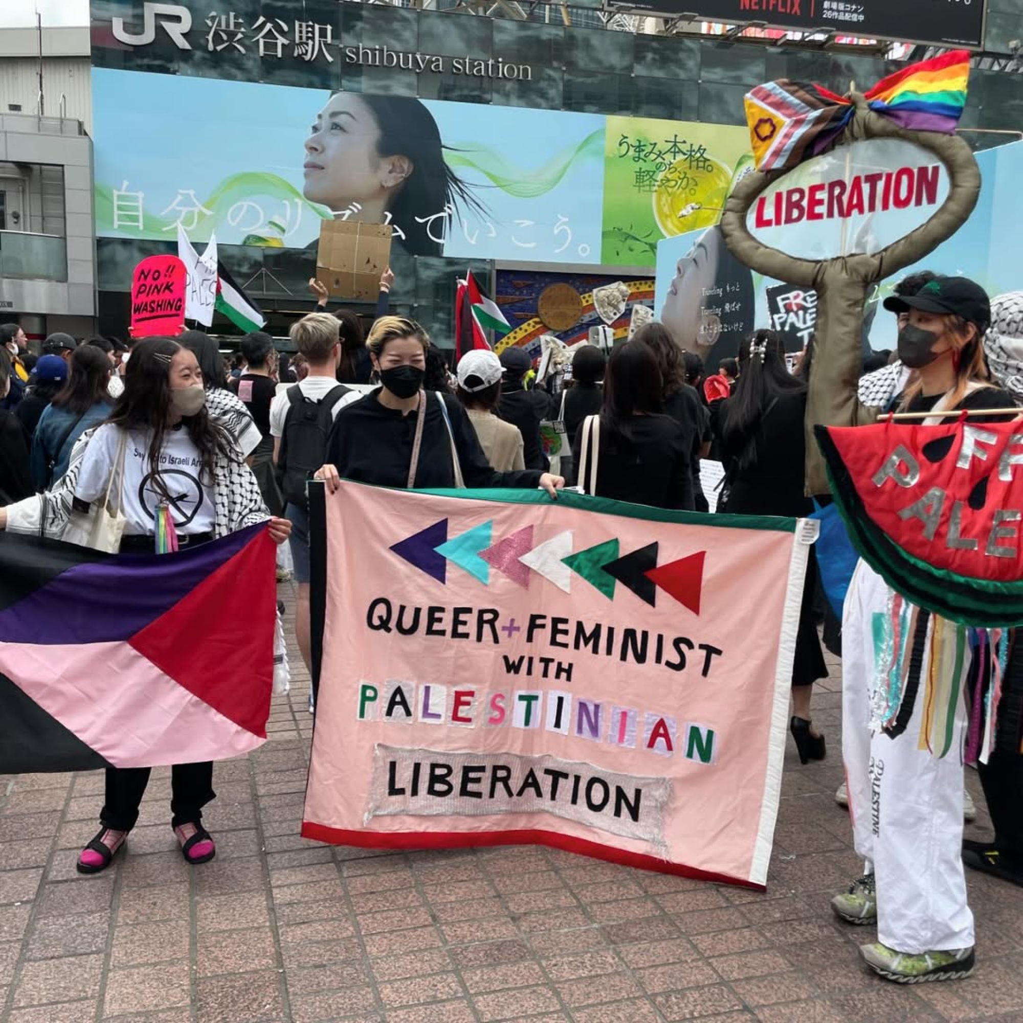 sucklaver@ (انستغرام)، نسويات كويريات مع تحرير فلسطين في موكب "طوكيو برايد"، 2025.