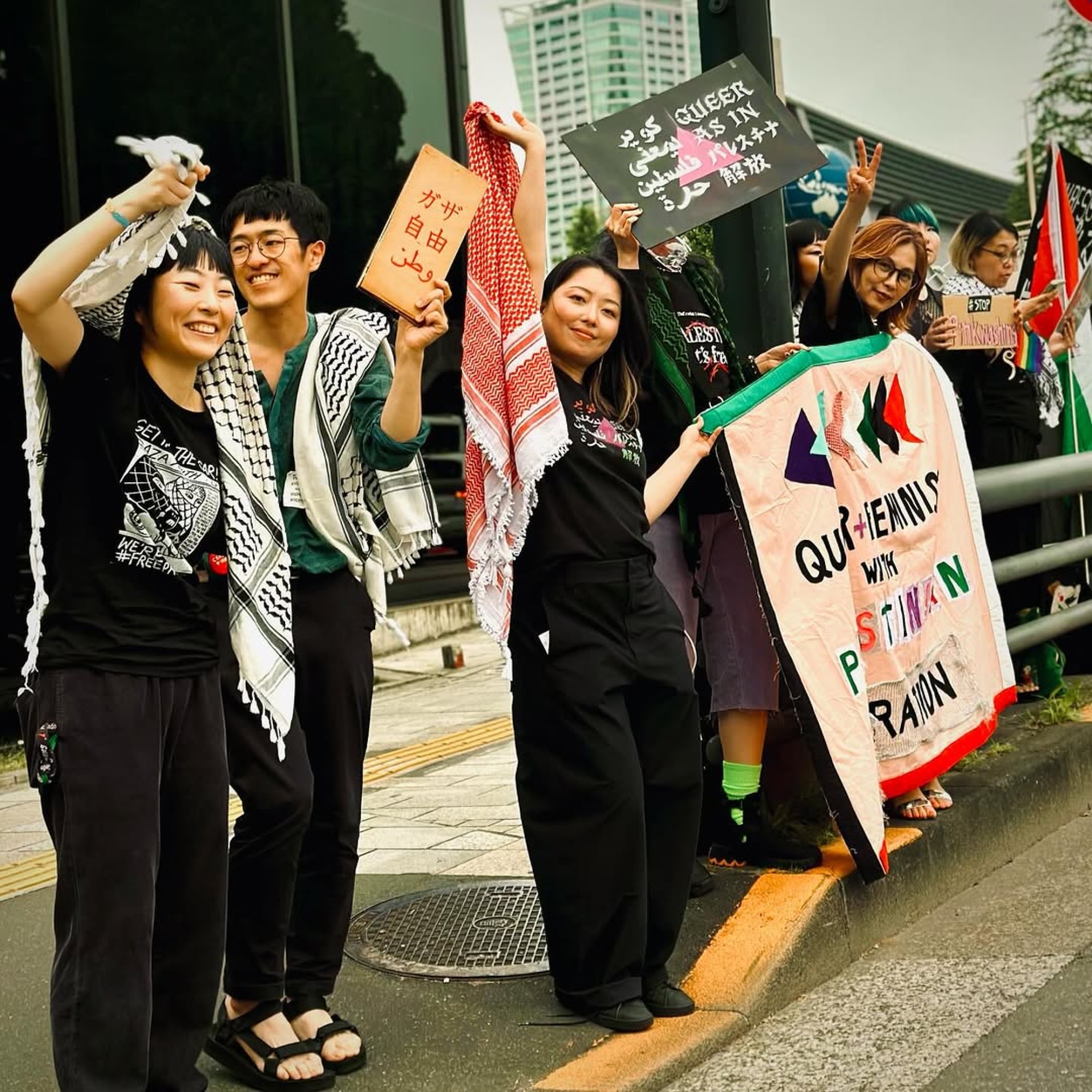 كما شارك ناشطون نسويون وكويريون في الاجتماع التأسيسي لـ"حركة مقاطعة اسرائيل في اليابان" (BDS Japan) عام 2018. وكانت "مجموعة العمل النسوية والفنّية السحاقية" (FLA) قد بدأت انخراطها منذ عام 2014 عبر حلقات قراءة ونقاش، قبل أن تنتقل إلى تنظيم أنشطة سياسية مباشرة ابتداءً من عام 2015.57 وفي عام 2018، كانت المجموعة من بين ست عشرة منظمة من منظمات المجتمع المدني التي أعلنت دعمها الرسمي لحركة "BDS اليابان".58 وقد أسهم هذا التفاعل الخلّاق بين "حركة مقاطعة اسرائيل" والمنظورات النسوية الكويرية التقاطعية في إعادة تشكيل حركة التضامن اليابانية–الفلسطينية. ولم يقتصر هذا التحوّل على توسيع أفق الحركة ونطاق تدخلها، بل أفضى أيضًا إلى تعميق الانخراط النقدي المتبادل بين النشاط الكويري والتضامن مع فلسطين، بما عزّز الوعي السياسي والأخلاقي داخل الحقلين.