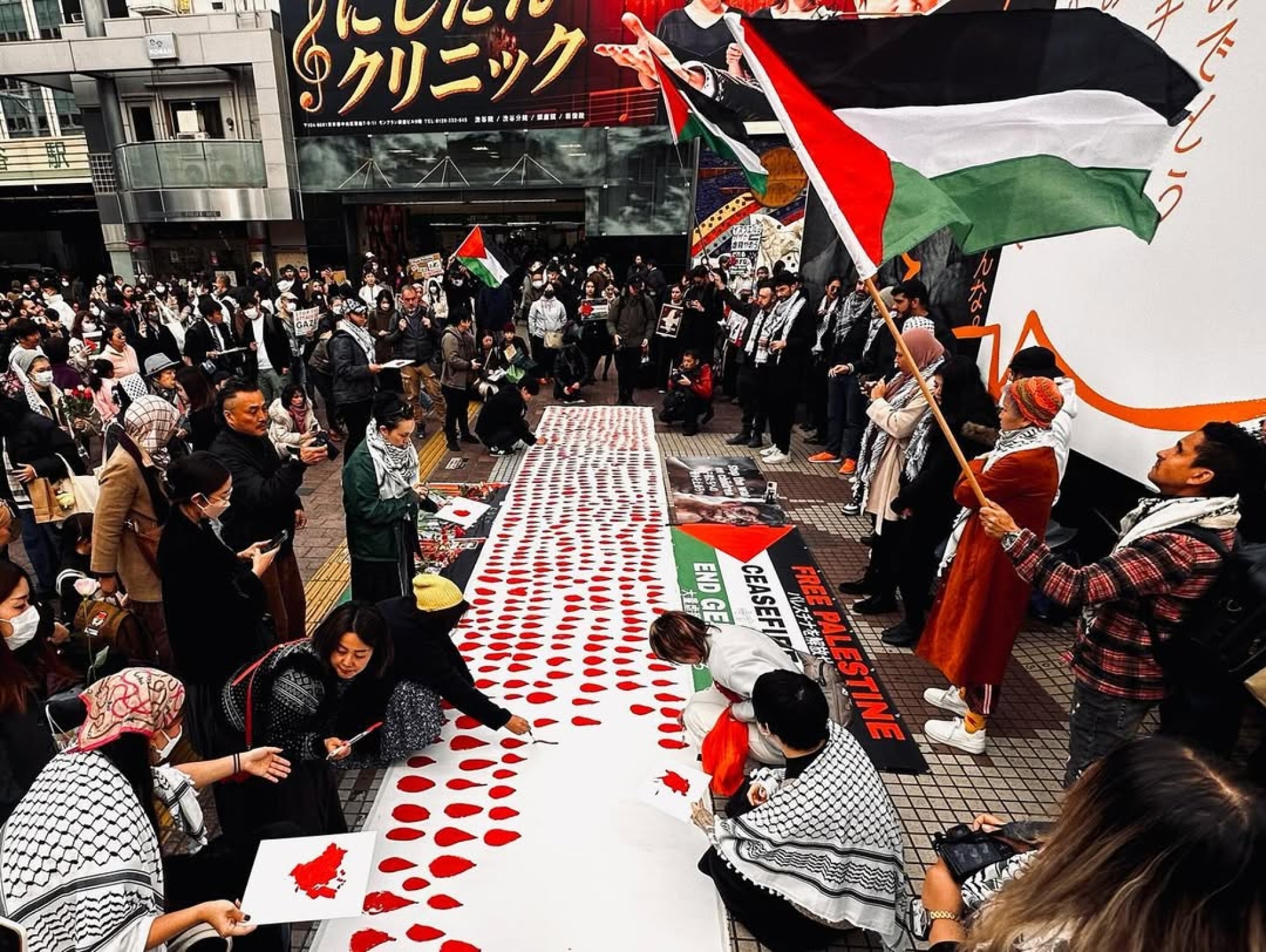 يُعدّ التعبير الثقافي والفني أحد المواقع الرئيسة التي يزدهر فيها هذا النوع من الانخراط المتبادل. ففي نوفمبر/تشرين الثاني 2023، أطلق فلسطينيون وعرب مقيمون في اليابان فعالية "دموع من أجل فلسطين" (Tears for Palestine)، التي تدعو المشاركين إلى رسم دموع حمراء على لافتة بيضاء بينما تُقرأ أسماء الشهداء في غزة بصوت عالٍ.87 قد يبدو هذا الفعل بسيطًا، لكنه يُعد مشاركة فاعلة في الاحتجاج: إذ يصبح الانخراط السياسي، الذي كان يُنظر إليه لعقود على أنه أمر صعب المنال، ممكنًا لجمهور ياباني أوسع.88 وقد حظيت "دموع من أجل فلسطين" بقبول واسع ومُورست في مدن عديدة عبر اليابان، بوصفها تجسيدًا ماديًا للحزن الجماعي والاحتجاج من أجل فلسطين. كما حظي الأرشيف البصري المؤثر للدموع الحمراء العديدة باهتمام إضافي عبر المنشورات على وسائل التواصل الاجتماعي والمعارض الفنية.
