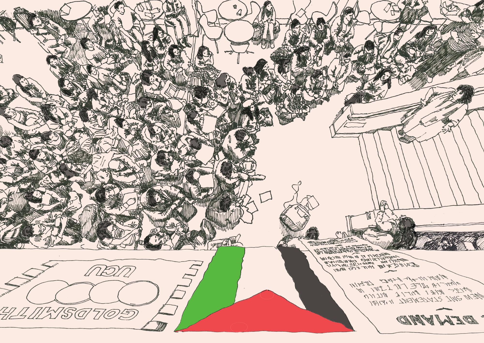 ممتنّة للغاية للفنّانة أبارنا كونات على هذا الرسم التخطيطي لاعتصام Goldsmiths for Palestine. تابعوا الأعمال المذهلة لأبارنا على إنستغرام: https://www.instagram.com/aparnakonat
