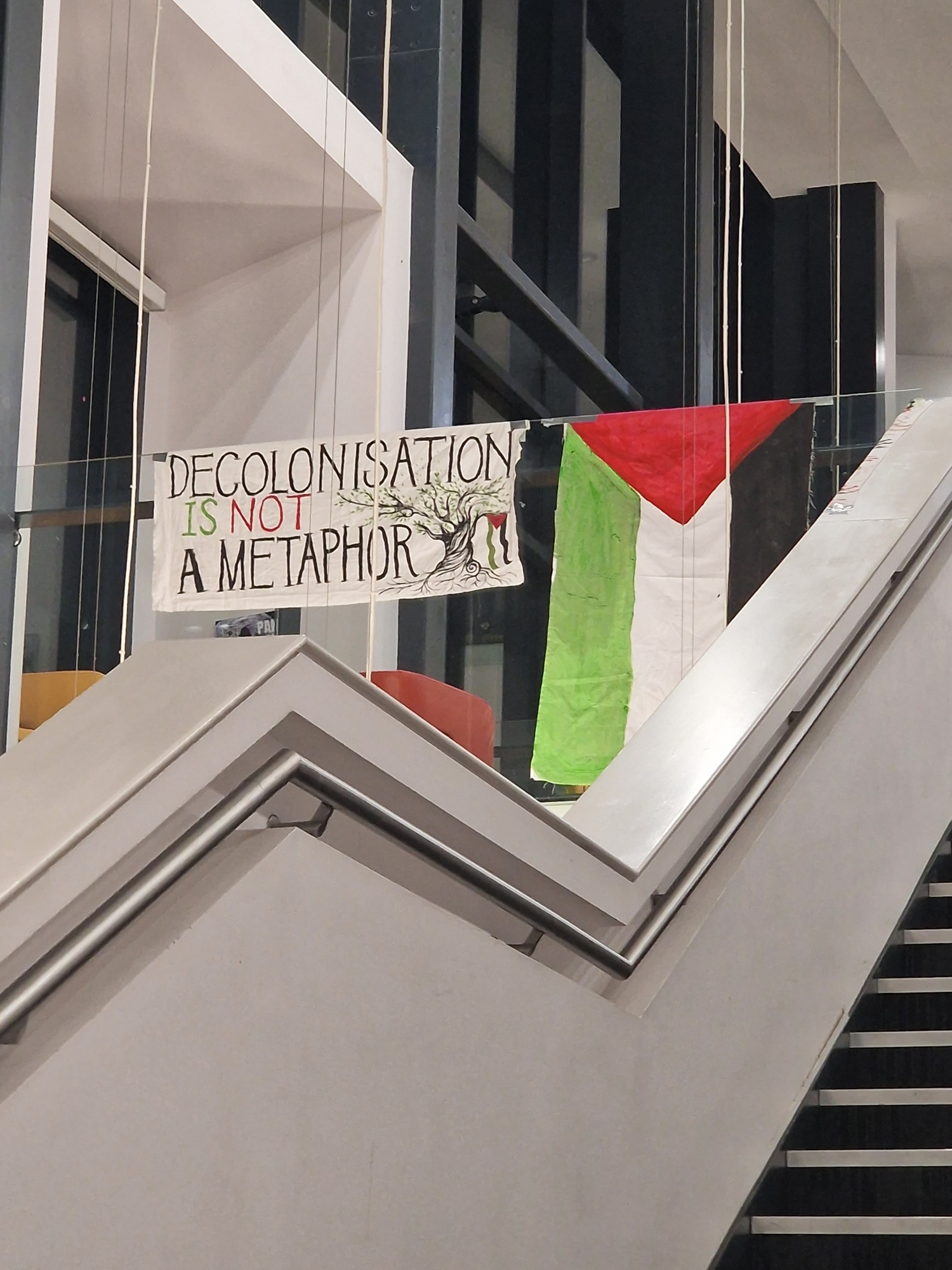 "ليست الديكولونيالية استعارةً مجازية". صورة خاصة. غولدسميث من أجل فلسطين، احتلال مبنى البروفيسور ستيوارت هول، 2024.
