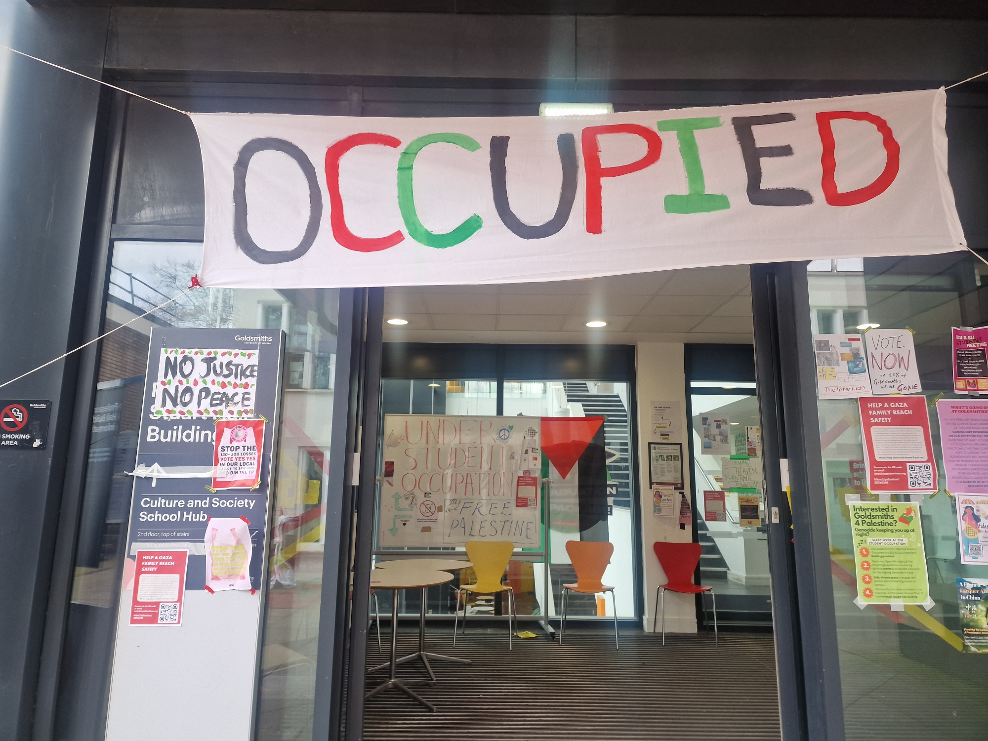 - 1. ي أواخر فبراير/شباط 2024، قام طلاب من G4P باحتلال مبنى البروفيسور ستيوارت هول (Professor Stuart Hall Building) في حرم غولدسميث، جامعة لندن (Goldsmiths, University of London) في جنوب شرق لندن، المملكة المتحدة. وطالبوا المؤسسة بإنهاء روابطها وتواطؤها مع إسرائيل، ودعم الطلاب الفلسطينيين من خلال التمويل وإعلان التضامن الصريح معهم. كان هذا الاعتصام – وربما أول مخيم طلابي في المملكة المتحدة عام 2024، والذي أصبح لاحقًا جزءًا من الانتفاضة الطلابية العالمية – قد تبعته اعتصامات يقودها الطلاب في المكتبة وCCA (مركز غولدسميث للفن المعاصر). وفي جميع هذه التحركات، إلى جانب الأفعال المباشرة، والتجمعات، والاحتجاجات، وتعطيل الأنشطة من أجل تحقيق المطالب، قام الطلاب والموظفون وأفراد المجتمع أيضًا بإنشاء مساحات للتعلّم، وبناء المجتمع، والتنظيم. https://www.instagram.com/goldsmithsforpalestine